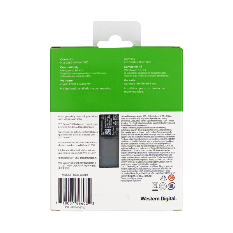 Contenido del paquete: SSD PCI-E 3.0 M.2 2280 2TB NVME WD GREEN SN350 3.200 MB/S WDS200T3G0C