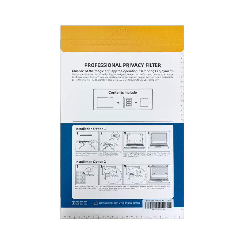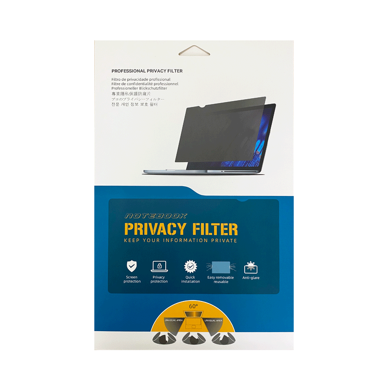 Los filtros de privacidad ayudan a mantener la información confidencial como las credenciales de inicio de sesión, los registros financieros de la empresa y otros datos privados a salvo. Claridad de visualización nítida y limpia directamente en frente de la pantalla, pero "oscurecida" en los ángulos de visión laterales entre 45° - 60°. Asegúrese de tener una primera línea de defensa sólida en la lucha contra la seguridad de los datos con un filtro de privacidad.