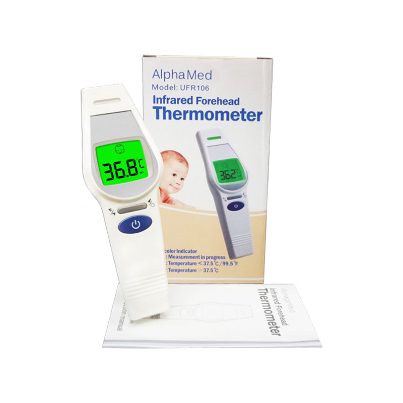 Termómetro digital Infrarrojo para tomar temperatura en la frente y sin contacto, marca Alphamed UFR106, ideal para monitoreo de salud y prevención en oficinas, hogar y hospitales.